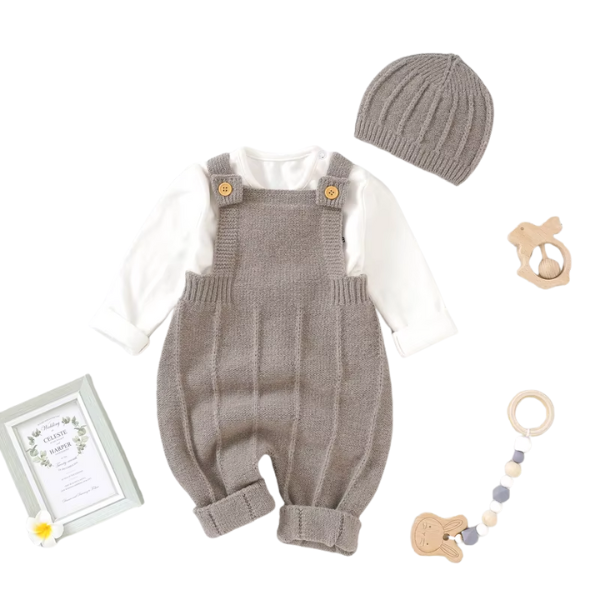 Maciez e aconchego para os dias mais fresquinhos! Este conjunto infantil de tricô vem com um macacão de alças ajustáveis e uma touquinha combinando, ideal para manter o bebê aquecido com muito estilo. Com toque leve como nuvem, é perfeito para passeios, fotos e momentos especiais. Disponível em lindas cores como bege, vinho e azul.